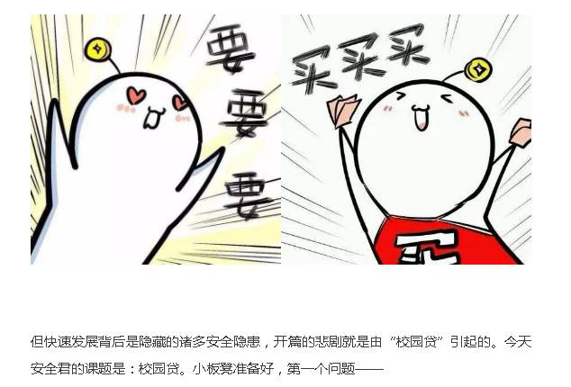 事件一:2016年3月,河南某高校的一名大学生,无力偿还从不同的校园金融平台获得的数十万元无抵押信用贷款,最终跳楼自杀。 事件二:2016年12月,“借贷宝裸条10G”的文件在网上流传,其中包含167名年轻女子的“裸条信息”,一时引起轩然大波。 安全君揭晓答案——这些都属于校园贷:近几年,校园贷在各大高校迅速“蹿红”,在总是缺衣服穿、余额总是不够的时候,无需担保,无需审查,只要动手指填表格,大学生就可以轻松贷到款项,花明天的钱,圆今天的梦,轻松拥有青睐已久的电子产品、护肤品、服装等等,深受大学生的喜爱。 校园贷通常分为三类: 一是专门针对大学生的分期购物平台,如如趣分期、任分期等,部分还提供较低额度的现金提现; 二是P2P贷款平台,用于大学生助学和创业,如投投贷、名校贷等; 三是大家用的比较多的阿里、京东等传统电商平台提供的信贷服务。 2009年,银监会叫停银行向学生发放信用卡业务,为大学生分期购物业务及贷款提供了生长的土壤。安全君认为:如果能借贷助学,减轻家里负担,或通过资本的合理流动,来解决大学生在自我提升和创新创业过程中面临的资金不足问题,也不失为一种选择。 但由于监管不力、行业人员良莠不齐、大学生自身消费观念扭曲等种种原因,校园贷乱象丛生。 图样图森破!借款前,不法分子打着诱人字眼,实际上却要以学生的身份信息作为抵押,这些个人信息可能被利用进行电信诈骗、骗取信用卡等,相信大家在这个时代或多或少耳闻信息泄露的危险。 一般起借金额不高,但会让你越借越多,停都停不下来。 NO!他们还会以手续费、罚息、服务费、违约金、滞纳金、催收费等名目,收取远远高于贷款本息的巨额费用,这些贷款公司在向大学生群体推销业务时,往往不详细告知贷款利息、违约金、滞纳金等收费项目的计算方式,致使某些涉世不深、自制能力较弱而又消费欲望旺盛(俗称人傻钱也不多)的大学生遭遇砍头息上当受骗。这不,你自己算算: 若逾期还款,催债手段无所不用。学生为缓解手头紧张的局面,一些同学会选择拆东墙补西墙,极易演化为“越滚越多”的情况,个人无法承担压力,濒临崩溃,严重的甚至引发悲剧;还会有女生选择“裸条”抵债,无论还款与否,这些女生的裸照都可能会被传出,有非法组织更以此衍生出“肉偿还款”和裸条信息贩卖等灰色盈利链条。 同时,校园贷固有其风险,但不能“一刀切”地剥夺大学生获得信用贷款这种金融服务的权利。为促进不良“校园贷”问题的有效解决,必须形成学校、公安、网信、金融等各相关部门的合力。不良的校园贷像金融毒品一样侵蚀着大学生,让其欲罢不能。面对这样的金融毒品—— 1. 树立理性的消费观,在没有能力的条件下,拒绝过度消费、超前消费。不相信天上掉馅饼。不轻易使用“校园贷”。 2. 为自己织一张安全网。掌握金融借贷知识,提高自我保护意识,提高风险识别能力。防止个人及家庭成员信息泄露,防止他人偷用自己的信息去借贷。防止“熟人想骗”。 3. 正在遭遇校园还贷压力或被校园贷诈骗的同学,第一时间将自己使用校园贷的信息反馈给辅导员、父母或保卫处,切不可进行“拆东墙补西墙”的做法或采取极端解决办法。 4. 赚取零花钱,另辟蹊径。通过自身努力申请丰厚的奖助学金;通过正规渠道申请国家助学贷款;选择校园勤工助学等方式赚取零用钱;选择正规的贷款平台,了解清楚利息还款方式。 安全君说: “大学生负债数十万自杀”等已是前车之鉴 不要因为一时的赌徒心理而深陷其中 我们提倡大学生 将自己的青春奉献给有意义的事情 好好享受我们人生中的美好时光。